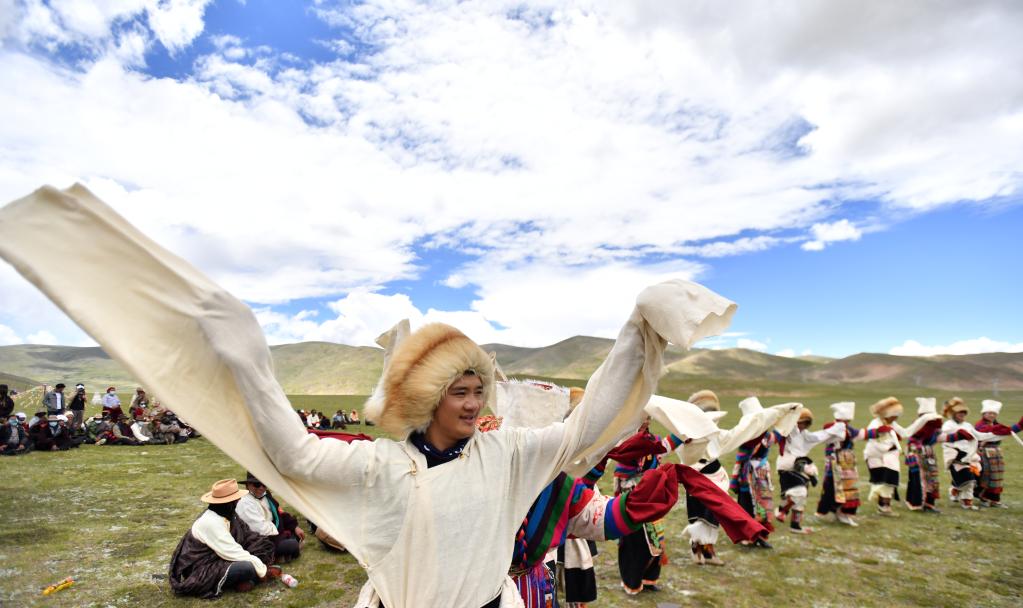 西藏班戈縣青龍鄉(xiāng)牧民在草原上跳舞(2021年7月15日攝)。 新華社記者 覺果 攝