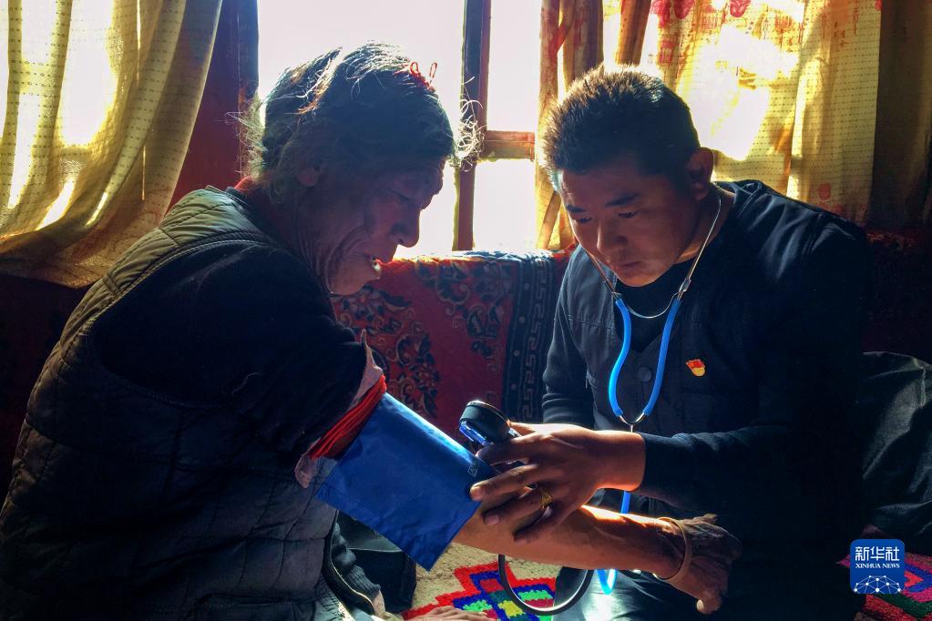 楚魯松杰鄉(xiāng)衛(wèi)生院院長次仁頓珠(右)在給巴卡村村民索朗多杰檢查身體(2018年12月22日攝)。新華社記者 陳尚才 攝