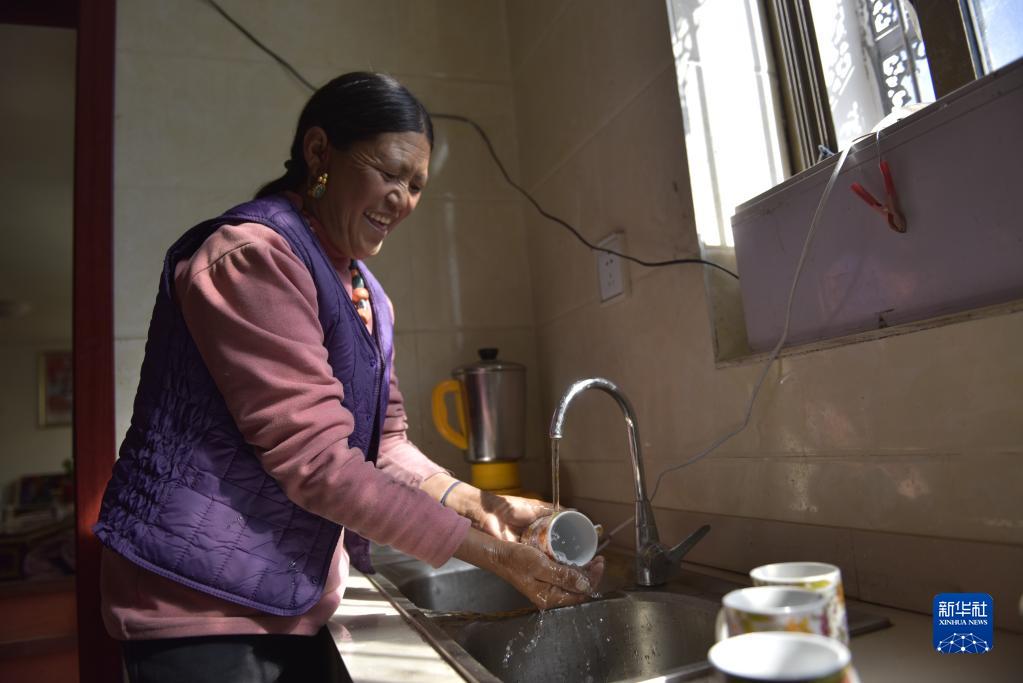 楚魯松杰鄉(xiāng)楚松村楚魯組村民強白桑姆用入戶自來水清洗茶碗(2021年9月18日攝)。新華社記者 格桑朗杰 攝