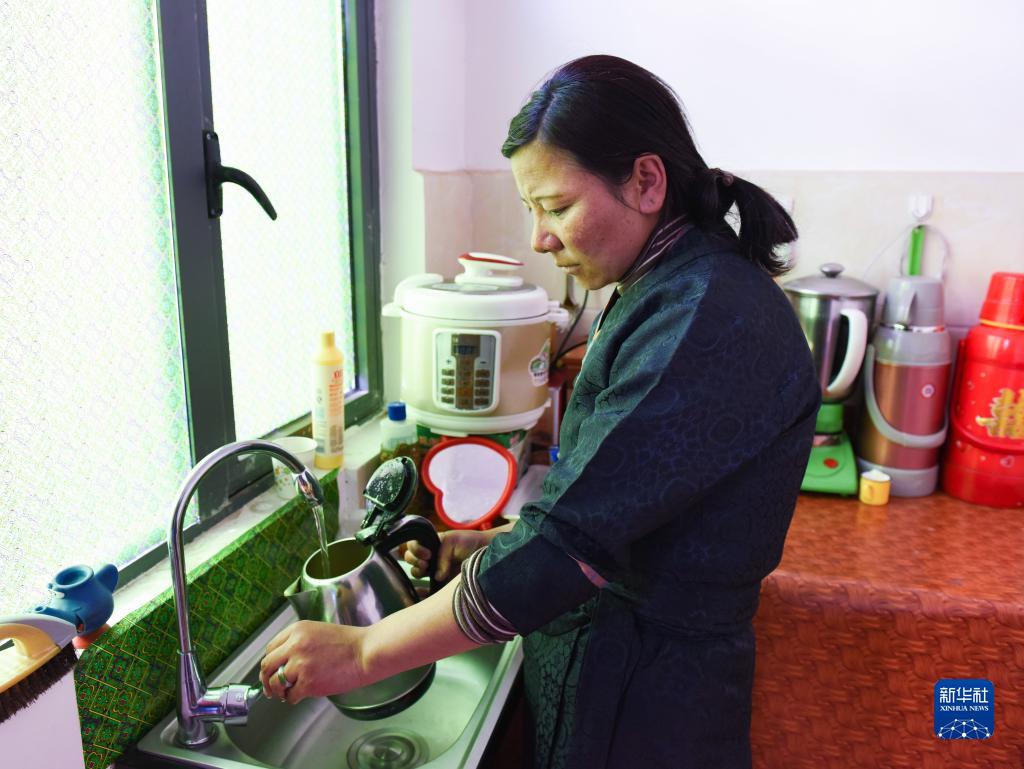 西藏山南市貢嘎縣森布日極高海拔生態(tài)搬遷安置點(diǎn)內(nèi),村民次仁卓嘎在家里用上了自來水。(2020年1月12日攝)。新華社記者 田金文 攝