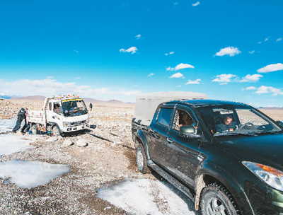 派出所的移民管理警察在巡邏途中協(xié)助牧民旦增多杰一家拖拽“罷工”的小貨車(chē)。新華社記者 孫非攝