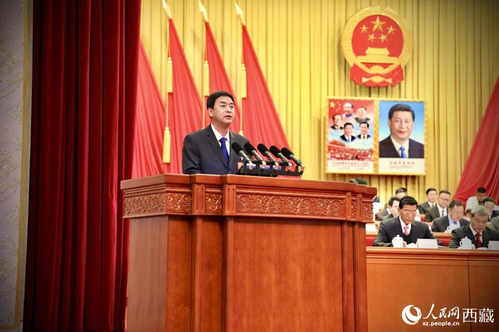 西藏自治區(qū)人民政府代理主席嚴金海向大會作政府工作報告。人民網(wǎng) 次仁羅布攝