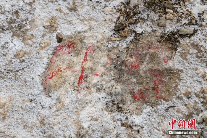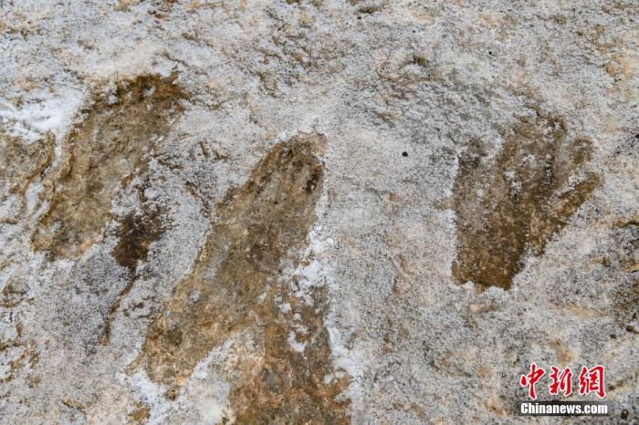 圖為1月19日拍攝的西藏拉薩市堆龍德慶區(qū)德慶鄉(xiāng)邱桑村邱桑溫泉石灰?guī)r上的“古人類手腳印”。中新社記者 貢嘎來松 攝