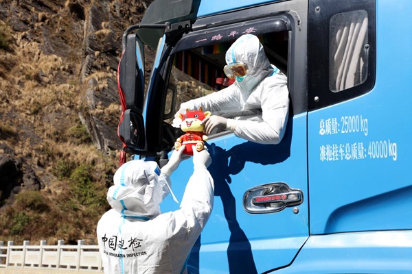 聶拉木邊檢站移民警察為貨車司機(jī)送新年禮物。李東洪攝