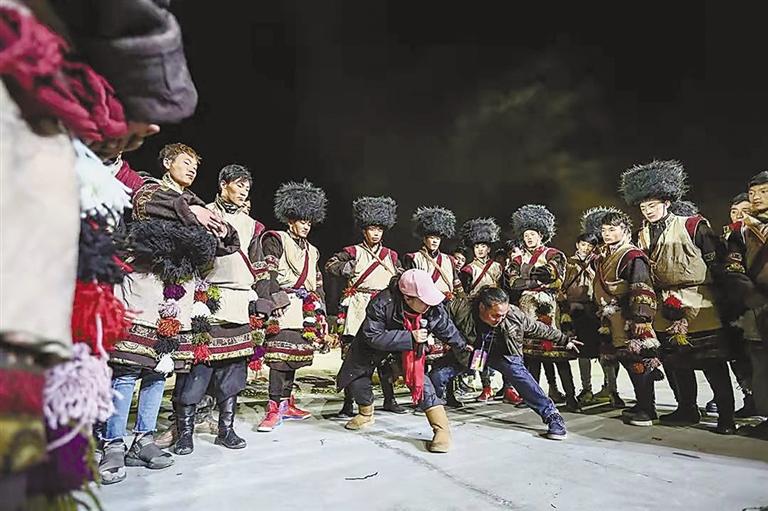 燈光放亮,音樂(lè)響起,史詩(shī)劇隨著夜色拉開(kāi)了帷幕,雨中的百人鍋莊在敞亮的舞臺(tái)激蕩起千層水光,篝火升騰,染紅了半壁寶瓶山,齊整的“打阿嘎”的遁地之聲伴著夜雨更加氣勢(shì)如虹,泥水淹過(guò)了腳踝,沿著舞蹈動(dòng)作的弧度在演員們的腳尖、衣袖間甩落出一條條數(shù)米長(zhǎng)的水痕線,面對(duì)匍匐、跪拜、奔跑、磕長(zhǎng)頭,甚至撲地打滾等舞蹈動(dòng)作,他們沒(méi)有一絲遲疑,衣帽已與泥水混為一體,雨夜中,同進(jìn)退,共歌舞。