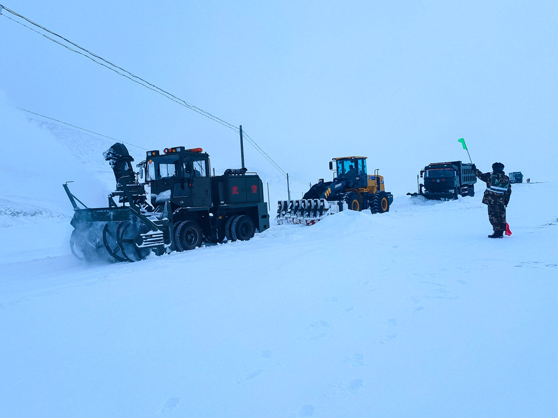 圖為武警官兵正在新藏線(xiàn)馬莜木拉段清理積雪。