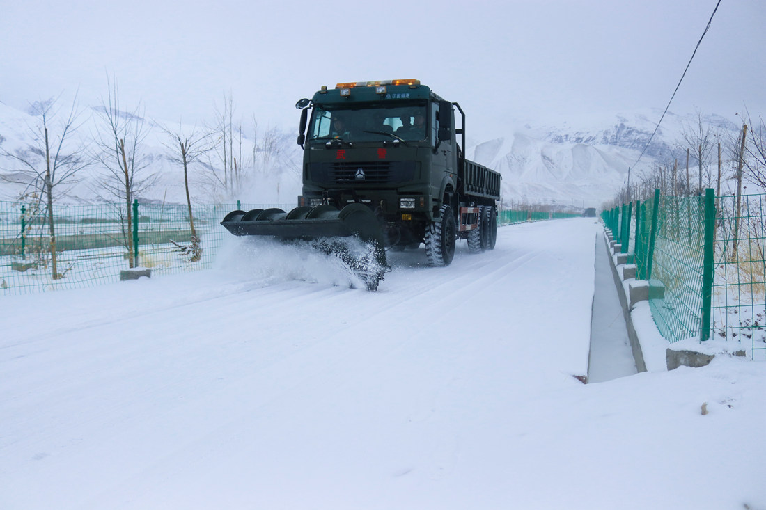 圖為武警官兵利用除雪車(chē)清理路面積雪結(jié)冰。
