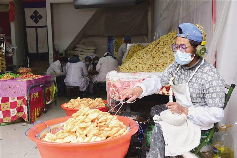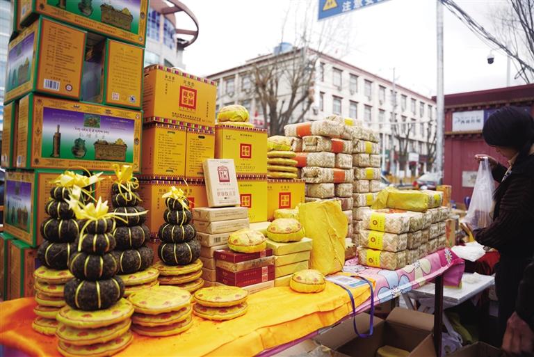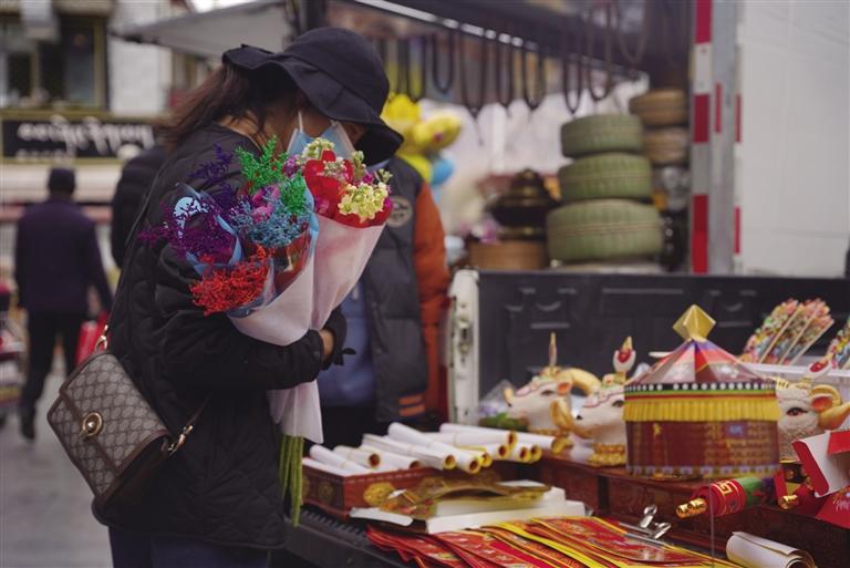 千門萬戶曈曈日,總把新桃換舊符。隨著各民族交往交流交融,藏文對聯(lián)也逐漸成為藏歷新年年貨市場中不可缺少的“成員”,寄托了人們對來年美好生活的殷切期盼。走進沖賽康市場,記者看到很多攤位都擺放著各式各樣紅色藏式對聯(lián),內(nèi)容主要蘊含平安、健康、長壽等吉祥的寓意,不時還有市民前來詢價選購。此外,每年藏歷新年前,不少書法家還會將滿載祝福的對聯(lián)寫好后送給市民,把濃濃的年味和對藏歷新年的祝福送到大家手中。