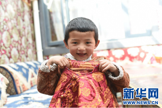 2月27日,在榮瑪鄉(xiāng)高海拔生態(tài)搬遷點藏曲村今年5歲的晉美塔杰展示新年的衣服。新華網(wǎng) 旦增努布 攝