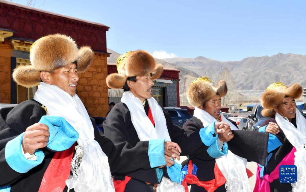 3月3日,西藏山南市貢嘎縣崗堆鎮(zhèn)農(nóng)民穿著嶄新的氆氌藏裝參加藏歷新年活動。新華社記者 覺果 攝