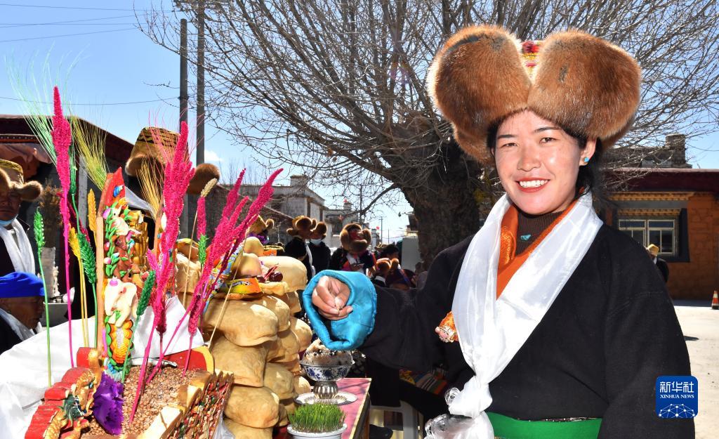 3月3日,西藏山南市貢嘎縣崗堆鎮(zhèn)群眾吃“切瑪”,祈福五谷豐登。新華社記者 覺果 攝