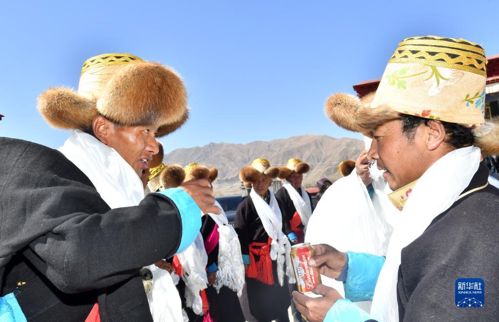 3月3日,西藏山南市貢嘎縣崗堆鎮(zhèn)農(nóng)民互相敬酒,慶賀藏歷水虎新年。新華社記者 覺果 攝