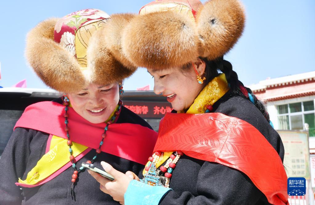 3月3日,西藏山南市貢嘎縣崗堆鎮(zhèn)群眾通過智能手機向外地的朋友拜年。新華社記者 覺果 攝