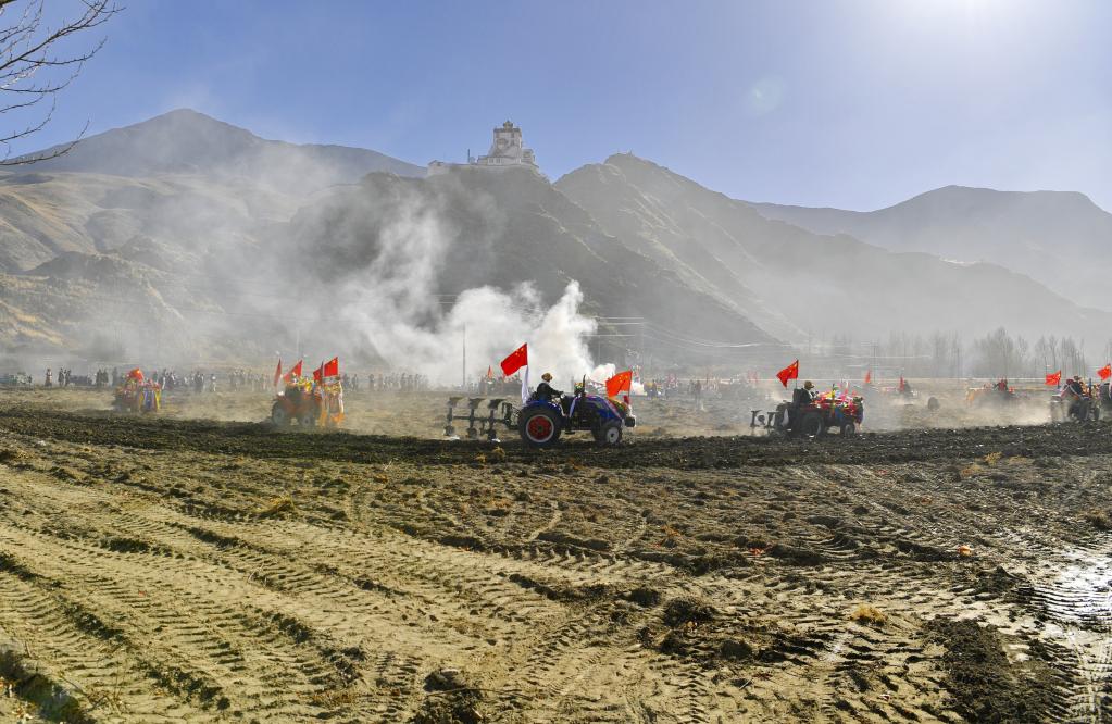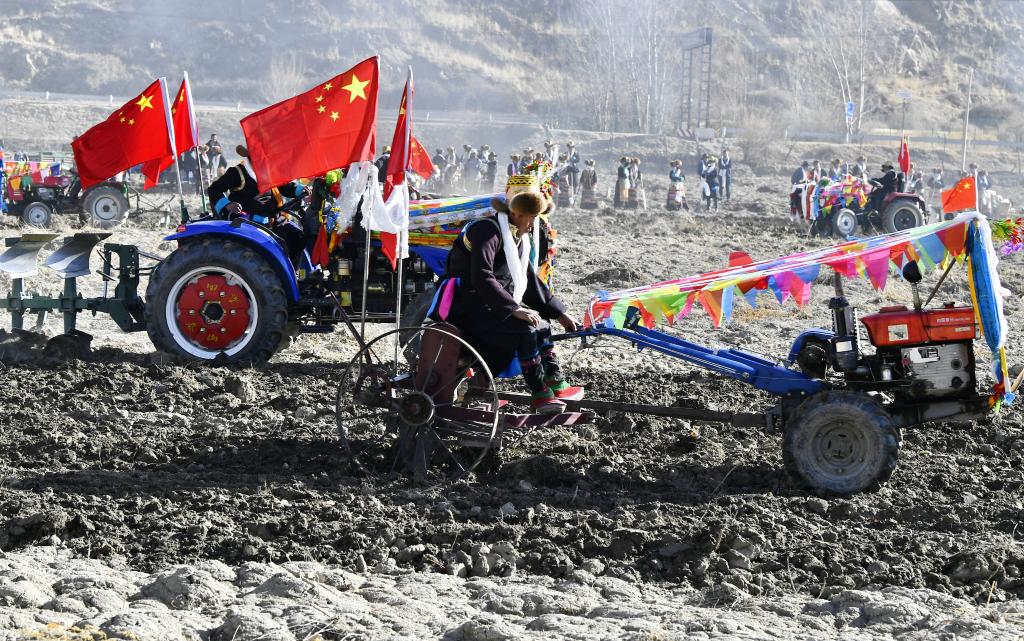 日頭漸高,春耕儀式準備就位。門中崗社區(qū)黨總支書記央金卓嘎說:“開耕嘍!”頓時,14臺拖拉機發(fā)出隆隆轟鳴聲,肥沃的田地被犁出一道道深深的壟溝。