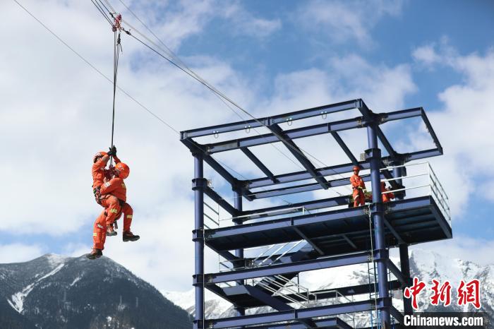 圖為消防指戰(zhàn)員利用橫渡系統(tǒng)轉(zhuǎn)運(yùn)傷員?!×种ナ猩窒乐ш?duì) 攝