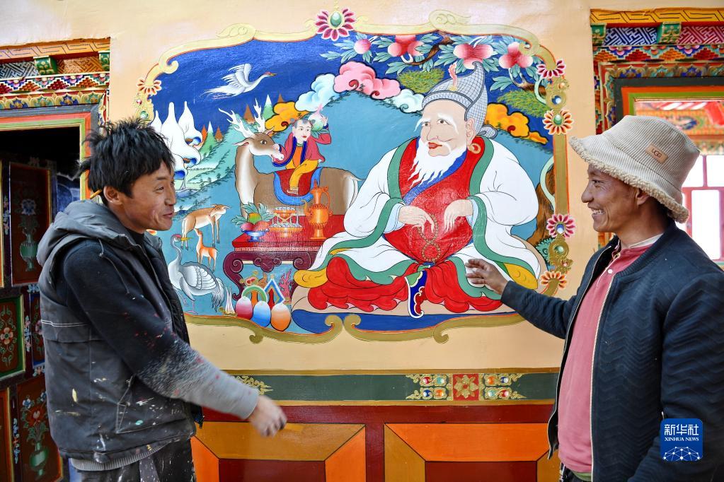 在湘河水庫(kù)移民新村,搬遷群眾拉巴旦增(右)與為自家新居繪制壁畫(huà)的民間藝人普布次仁交流(3月27日攝)。新華社記者 張汝鋒 攝