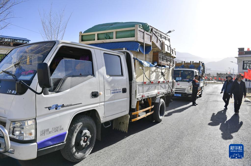 為搬遷群眾運(yùn)送家具的車(chē)輛駛?cè)胂婧铀畮?kù)移民新村(3月27日攝)。新華社記者 張汝鋒 攝