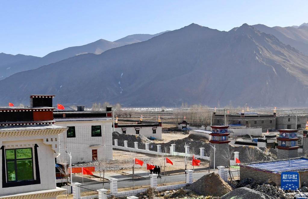 在湘河水庫(kù)移民新村,搬遷群眾羅布占堆在新居屋頂豎起五星紅旗(3月27日攝)。新華社記者 張汝鋒 攝