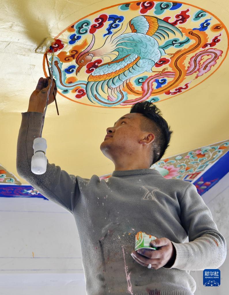 來(lái)自日喀則的民間藝人在湘河水庫(kù)移民新村一處民居繪制屋頂(3月27日攝)。新華社記者 張汝鋒 攝