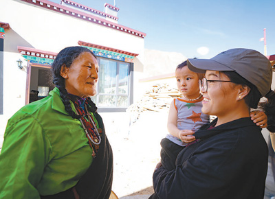 雙湖縣措折羌瑪鄉(xiāng)干部邊巴拉姆(右一)在搬遷群眾家走訪。記者 徐馭堯攝