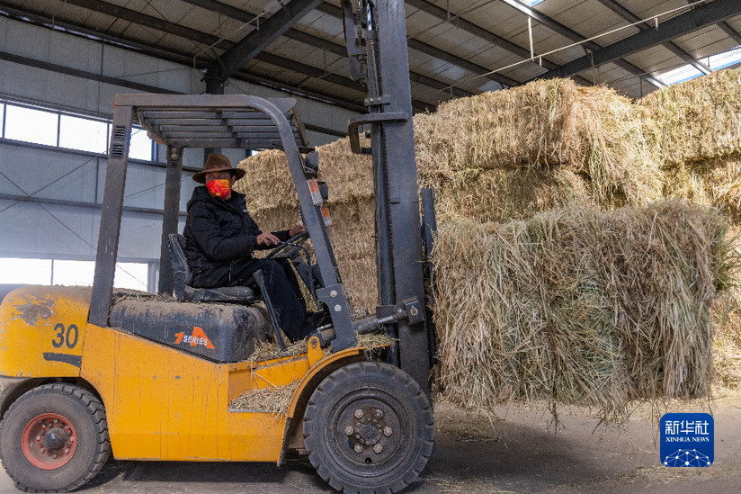 貢培在西藏娘亞牦牛養(yǎng)殖產(chǎn)業(yè)發(fā)展有限責(zé)任公司的飼草料倉庫工作(3月30日攝)。新華社記者 周荻瀟 攝