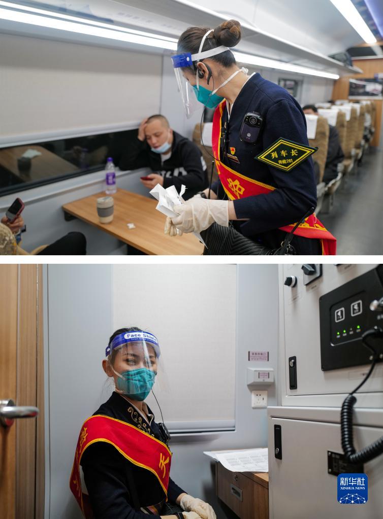 拼版照片:上圖為3月27日,劉文靜在列車(chē)上檢查衛(wèi)生;下圖為劉文靜在列車(chē)廣播室。C893次列車(chē)長(zhǎng)劉文靜已經(jīng)在鐵路工作近十年,先后在青藏、拉日、拉林三條鐵路線任職,親身經(jīng)歷十年來(lái)西藏鐵路運(yùn)輸?shù)木拮?。新華社記者 洛卓嘉措 攝
