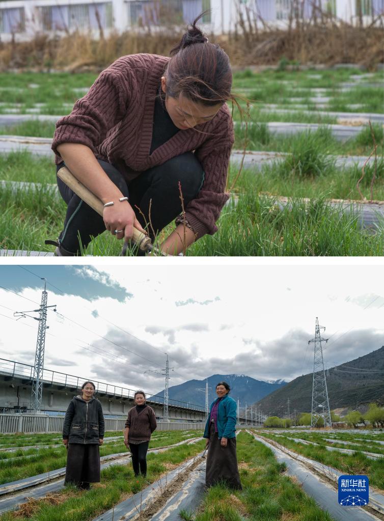 拼版照片:上圖為3月30日,尼瑪?shù)录谒{(lán)莓種植基地工作;下圖為尼瑪?shù)录ㄖ校┘巴抡驹谒{(lán)莓種植基地中,背后是鐵路橋。麥巴村村民尼瑪?shù)录衲陝倽M20歲,此前在林芝巴宜區(qū)一家藏餐館打工,后來(lái)回到村里設(shè)立的藍(lán)莓種植基地工作。尼瑪?shù)录f(shuō),能在家門(mén)口工作令她很開(kāi)心,她每天都能看到火車(chē)從旁邊經(jīng)過(guò),希望有一天也能坐上火車(chē)去拉薩逛一逛。新華社記者 洛卓嘉措 攝