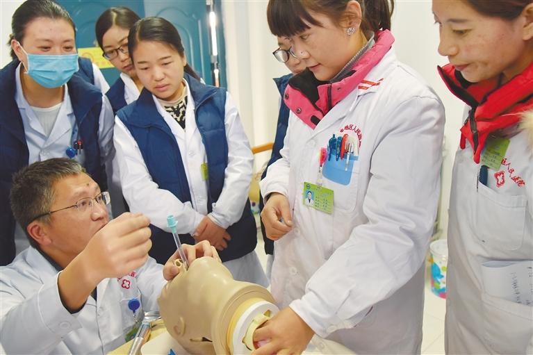 圖為西藏自治區(qū)那曲市人民醫(yī)院援藏專(zhuān)家手把手向醫(yī)務(wù)人員傳授“氣管插管術(shù)”動(dòng)作要領(lǐng)。記者 次仁片多 攝