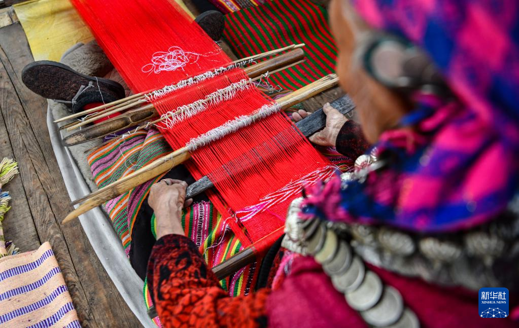 今年72歲的本央老人,是僜人服飾制作技藝西藏自治區(qū)級(jí)非遺傳承人。在西藏林芝市察隅縣沙瓊村,老人身著傳統(tǒng)的僜人服飾,在自家的涼亭里編織布料。