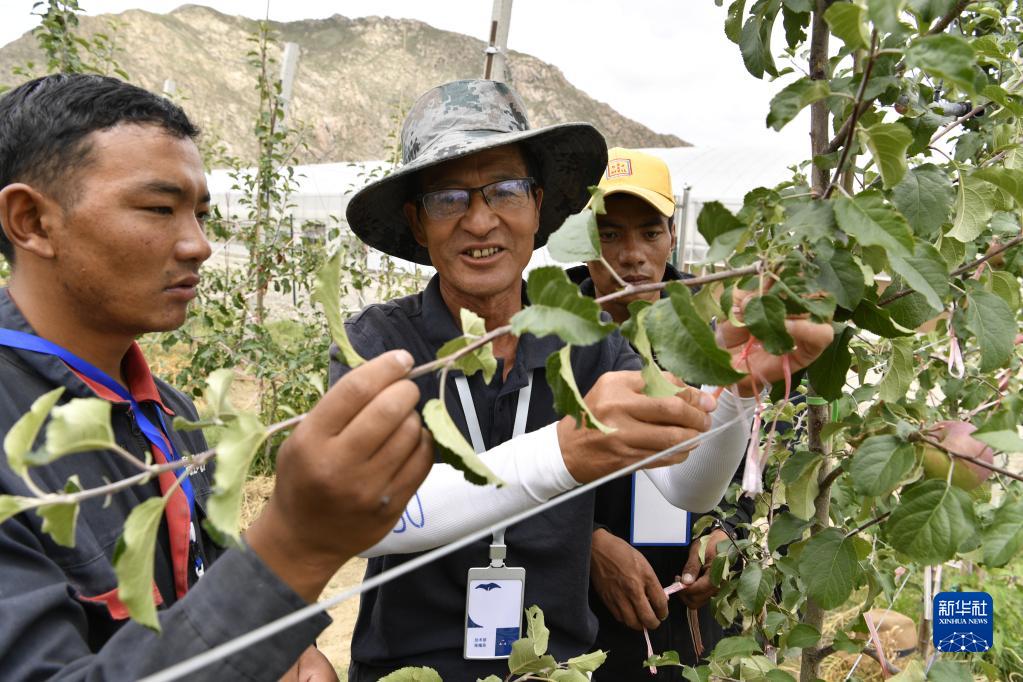 技術(shù)人員(中)在指導(dǎo)森布日村村民管理蘋(píng)果樹(shù)(資料圖)。新華社記者張汝鋒攝