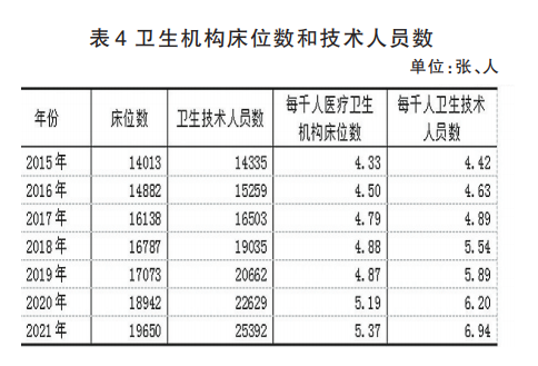 年末全區(qū)共有衛(wèi)生機(jī)構(gòu)1650個。其中,醫(yī)院179個,鄉(xiāng)(鎮(zhèn))衛(wèi)生院675個,社區(qū)衛(wèi)生服務(wù)中心(站)14個,疾病預(yù)防控制中心82個,婦幼保健院(站)36個。醫(yī)療衛(wèi)生機(jī)構(gòu)實(shí)有床位數(shù)19650張。其中醫(yī)院14808張。衛(wèi)生技術(shù)人員25392人。其中執(zhí)業(yè)(助理)醫(yī)師10448人。每千人醫(yī)療衛(wèi)生機(jī)構(gòu)床位數(shù)5.37張。每千人衛(wèi)生技術(shù)人員數(shù)6.94人。每千人執(zhí)業(yè)(助理)醫(yī)師數(shù)2.85人。