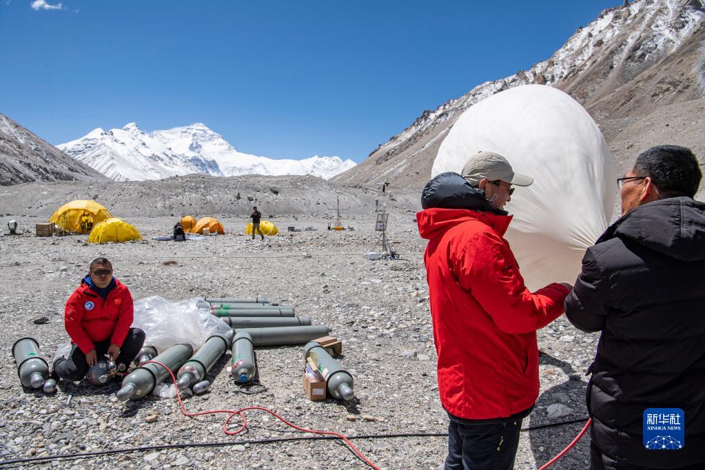 這是在珠峰登山大本營,科研人員施放的大氣臭氧探空氣球(5月3日攝)。新華社記者 孫非 攝
