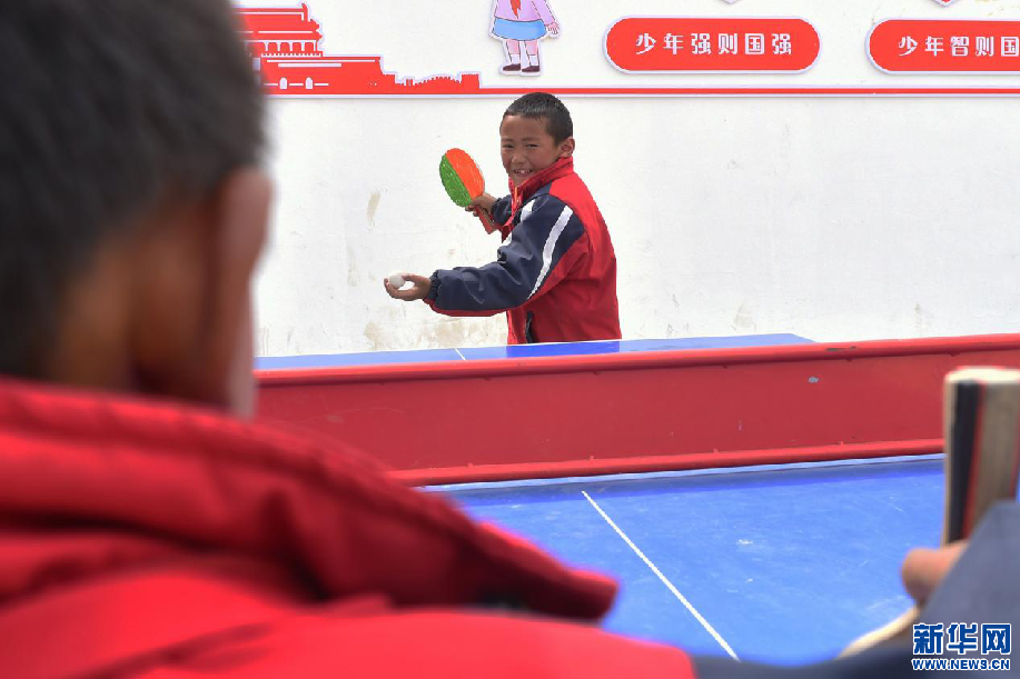 多油村中心小學(xué)的學(xué)生在課余時間玩乒乓球(4月21日攝)。新華網(wǎng) 旦增努布攝