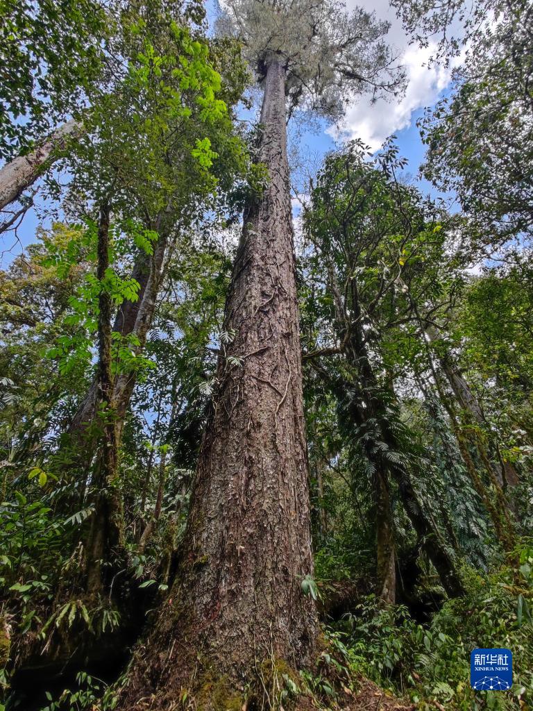 這是科研人員在西藏自治區(qū)墨脫縣背崩鄉(xiāng)格林村記錄到的高達76.8米的不丹松。(采訪對象供圖)