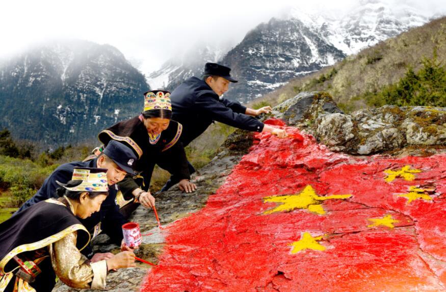 圖為玉麥邊境派出所戍邊民警與“時(shí)代楷?!鲍@得者卓嘎、央宗姐妹共同描繪國旗。蔣美靈 攝
