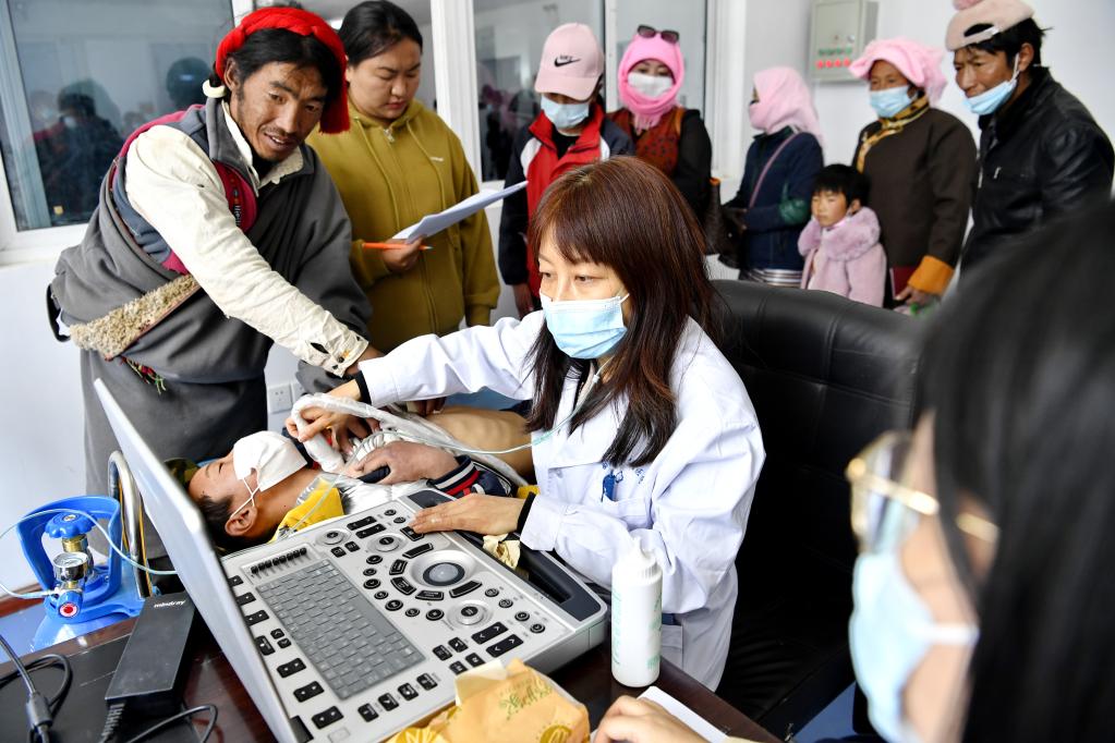 江蘇泰州市人民醫(yī)院援藏醫(yī)生在拉薩市當雄縣人民醫(yī)院為一名兒童做檢查。新華社記者李鍵攝