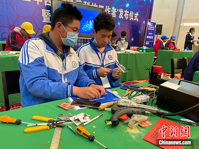 圖為未來太空車主題制作組參賽選手根據(jù)自己的創(chuàng)意正在組裝太空車。 中新社記者 趙朗 攝