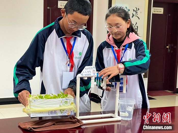 圖為智慧社區(qū)中學(xué)組參賽選手向評委老師展示作品《太陽能自動澆灌系統(tǒng)》的工作原理。 中新社記者 趙朗 攝