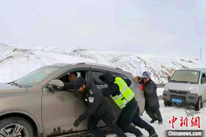 西藏安多交警為受困民眾推車。安多縣公安局交警大隊(duì) 供圖