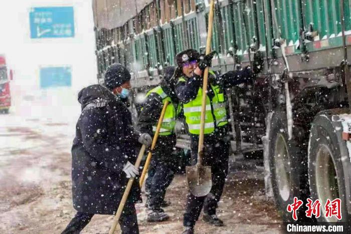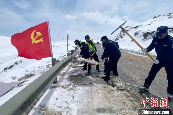 安多交警在唐古拉山埡口清理積雪。安多縣公安局交警大隊(duì) 供圖