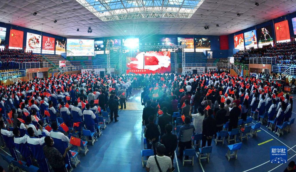 山南市第二高級中學(xué)學(xué)生在體育館觀看中華詩文朗誦會(6月3日攝)。新華社記者 劉洲鵬 攝