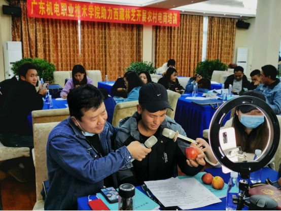 圖為學(xué)員在培訓(xùn)導(dǎo)師指導(dǎo)下通過(guò)網(wǎng)絡(luò)直播銷售產(chǎn)自林芝本地的蘋果。