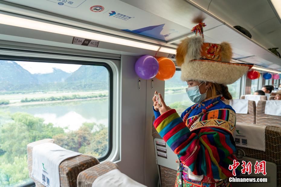 圖為當日,西藏拉林鐵路通車一周年活動上,那曲安多牧民德吉次仁身著傳統(tǒng)盛裝首次體驗高原復興號,在進入林芝后記錄“雪域江南”風光。 中新社記者 江飛波 攝