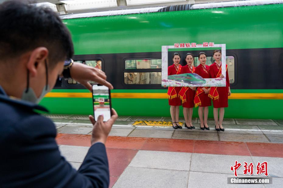 圖為當日清晨,拉薩火車站,C881次列車出發(fā)前,“動姐”們在高原復興號前合影留念,紀念拉林鐵路通車一周年。 中新社記者 江飛波 攝
