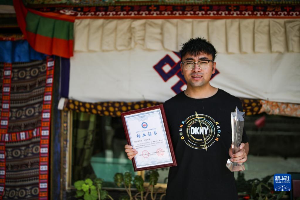 “格桑花開”大學(xué)生就業(yè)創(chuàng)業(yè)特訓(xùn)營學(xué)員、江蘇今世緣酒業(yè)股份有限公司甘青藏大區(qū)業(yè)務(wù)經(jīng)理土旦平措展示特訓(xùn)營結(jié)業(yè)證書和“區(qū)外就業(yè)之星”獎杯(2022年6月23日攝)。新華社記者 姜帆 攝