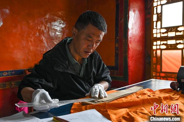 圖為6月27日,拉薩,西藏自治區(qū)藏醫(yī)院文獻研究所相關負責人次旦平措對交接而來的古籍檢查測量尺寸。 中新社記者 趙朗 攝