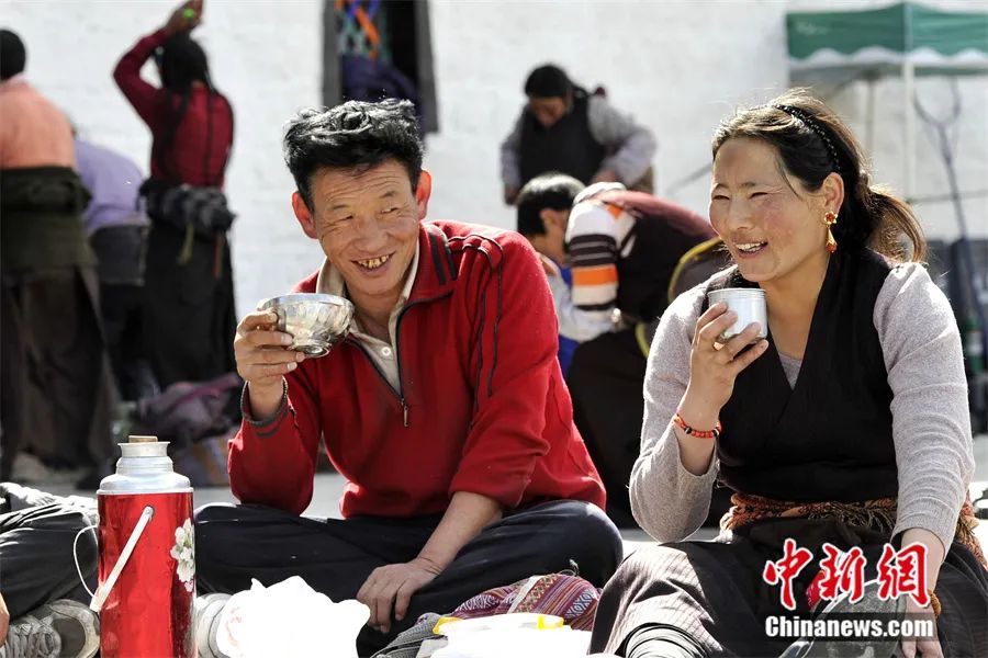 2012年3月,西藏拉薩,民眾在大昭寺廣場(chǎng)上邊喝酥油茶邊聊天。中新社記者 李林 攝