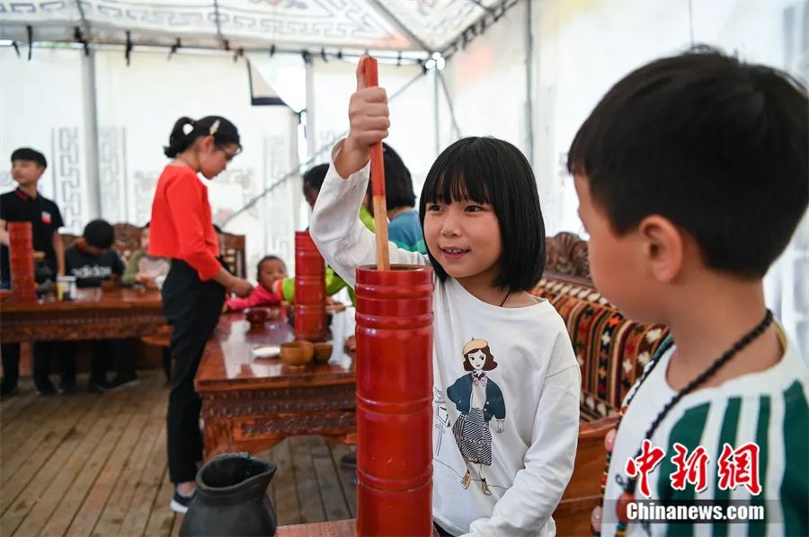 2019年7月,來(lái)自江蘇蘇州的小游客們?cè)诶_體驗(yàn)酥油茶制作。中新社記者 何蓬磊 攝