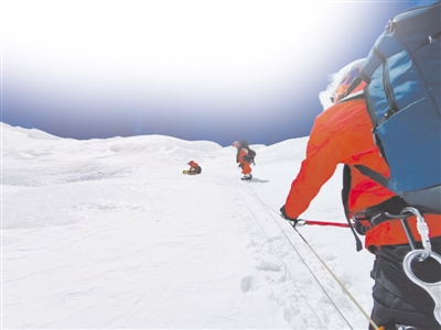 但還是碰上了意外。從8300米再往上走,積雪有五六十厘米深,沿路安全繩都被雪埋了。安全繩是登頂?shù)纳K,大家必須把繩子拽出來,抖掉冰,再一點(diǎn)點(diǎn)前進(jìn)。到達(dá)海拔8800米處,比原計(jì)劃晚了三個(gè)小時(shí)。