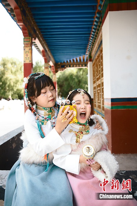 圖為7月13日,兩位小游客在拉薩體驗藏族服飾寫真。 中新社發(fā) 郭琳 攝